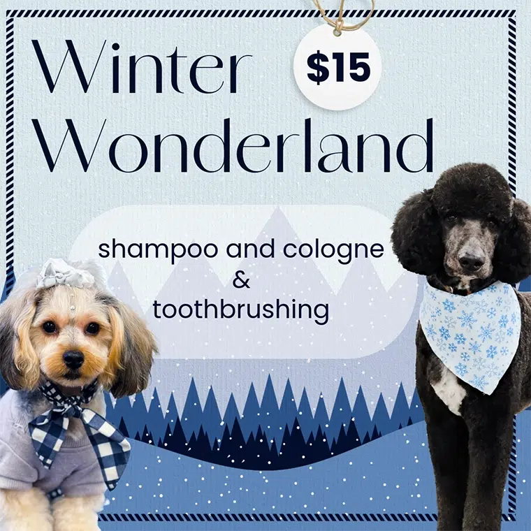 Add our Winter Wonderland shampoo and cologne, plus an additional toothbrushing to your pet’s groom for just $15 all month long! Our January Service Special may be added on to any regularly priced grooming package. Ask your groomer to add our special to your pet’s next grooming appointment!