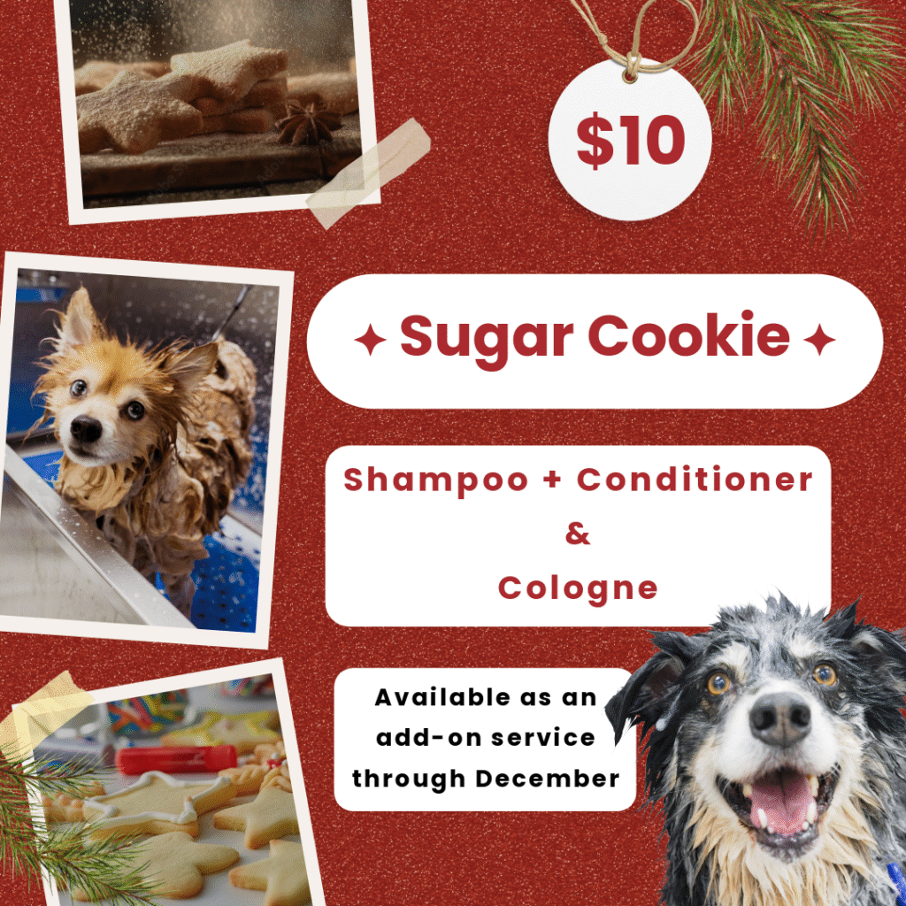 Our December Service Special may be added on to any regularly priced grooming package. Add our Sugar Cookie Shampoo, Conditioner, & cologne to your pet’s groom for just $10 all month long! Ask your groomer to add our special to your pet’s next grooming appointment!